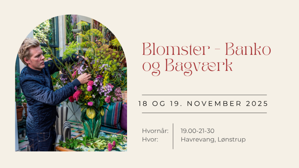 Havrevang i Lønstrup inviterer til en inspirerende og sjov aften, hvor den kreative blomsterdekoratør Jeppe Urban demonstrerer ideer til smukke vinter blomsterdekorationer med udgangspunkt i, hvad naturen har at byde på lige nu. Undervejs bliver der serveret kaffe med hjemmelavet bagværk.
