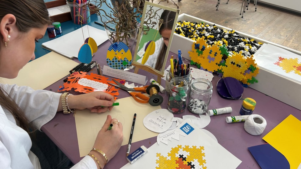 I værkstedet kan du tegne, male og bygge din helt egen kylling i Plus-Plus-brikker, som du kan tage med hjem bagefter.